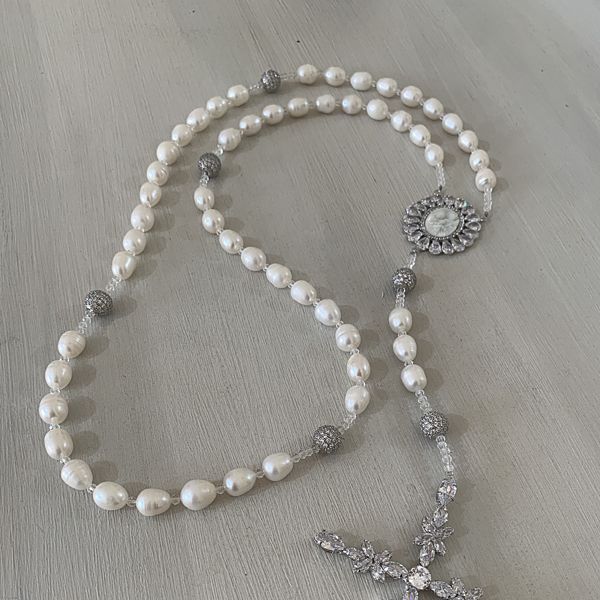 Terço em contas de pérolas de água doce barrocas, com tamanos em média de 9mm, montadas no fio e separadas por mini contas de cristal lapidado, com camafeu de zirconias e santo em madrepérolas à sua escolha, crucifixo em zirconias modelo Marcelia, em banho diamante.